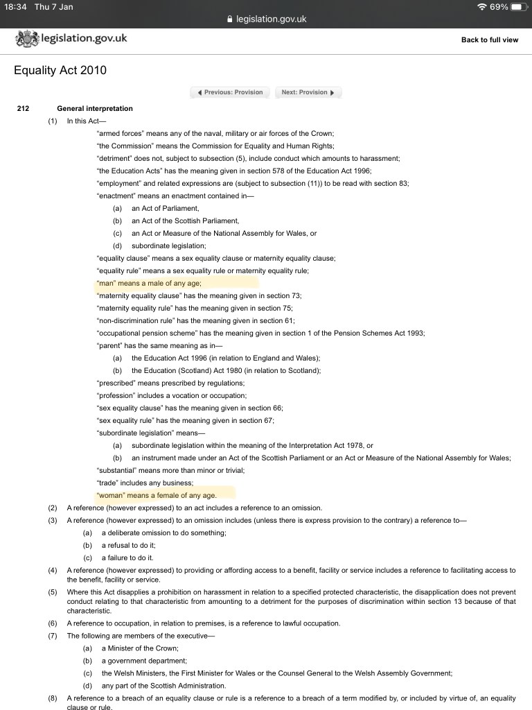 Sex is clearly defined in UK law, for example legally, woman is defined as “a female of any age” under the understanding that words “female” as well as “male” refer to humans and are understood to mean the two biological sex classes needed for sexual reproduction.