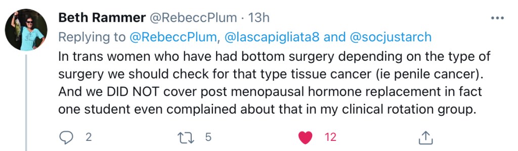 “In trans women who have had bottom surgery depending on the type of surgery we should check for that type tissue cancer (ie penile cancer). And we DID NOT cover post menopausal hormone replacement in fact one student even complained about that in my clinical rotation group.”