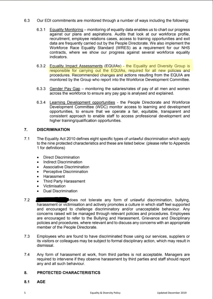 Page 4 claims that this policy has been impact assessed (without offering any insight into the impact of this policy on various protected characteristics) and it continues to misrepresent protected characteristics by replacing “sex” with “gender”. It also informs the reader that they “continue to partner with external diversity partners for expert advice on ensuring [they] remain an inclusive employer of choice“.