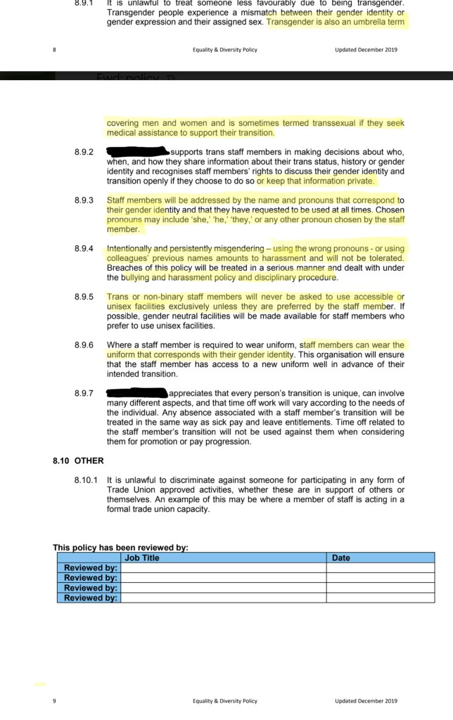 Equality and diversity at the moment is rightly focussed on BAME and the gender identity issues are not in focus. The hospice always has a space with Hospice UK at PRIDE and there are a good mix of sexualities on staff. There was a trans-identified male employee whose attitude was quite passive aggressive and I have suspicions the policy was rewritten with their help. The trans-identified male started to present as female after being employed for a while, it wasn’t discussed or announced so there were more than a few foot in mouth moments.”