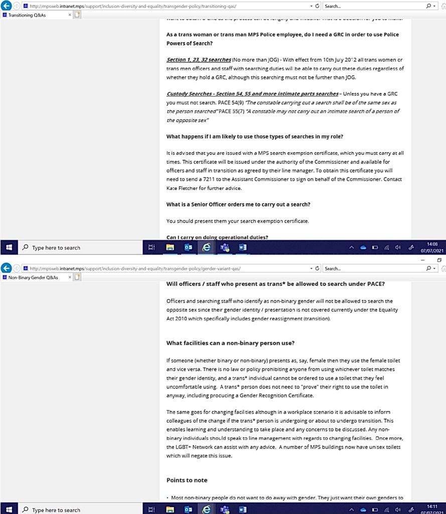 It also talks about changing rooms and toilets and the gender you feel comfortable with – whilst also saying that no medical transition is necessary. All implemented by the Met without consulting female staff – for Stonewall points – and when there was an officer recently in court for filming a female colleague in the shower while they were on a residential course. This Stonewall document states that searching guidelines are ‘under review’. However, the Met seem to be on the ball in this case and have gone back to the Equality Act – thank goodness.”