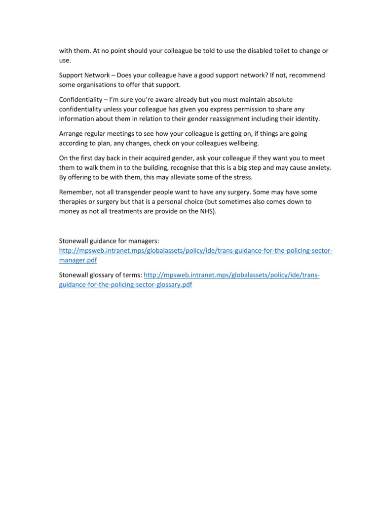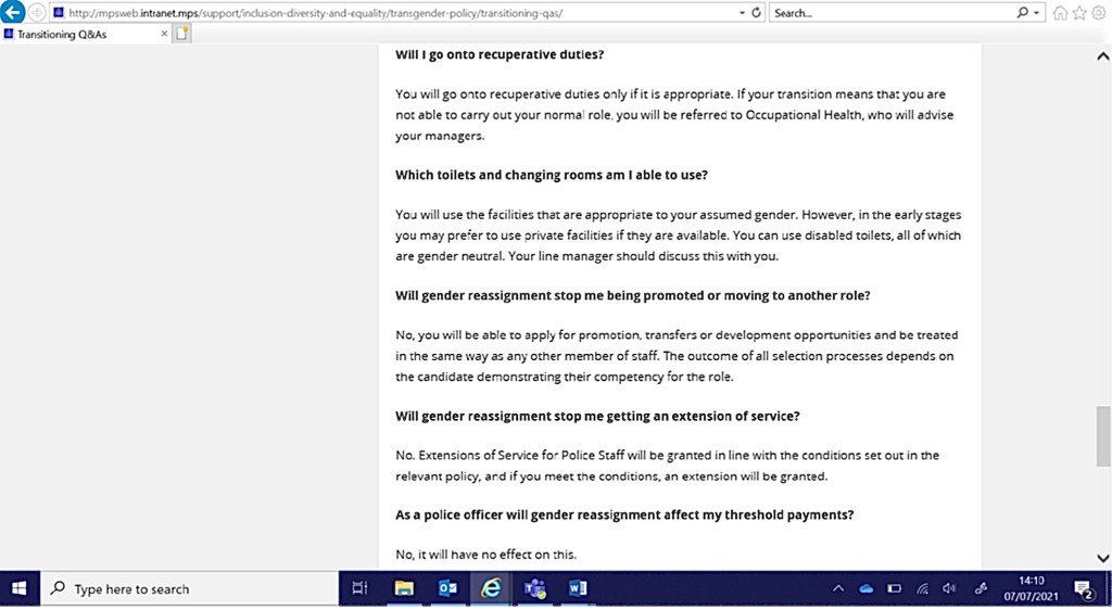“This is a Q&A trans guide, available on the Met intranet site, for staff to access. It talks of using the facilities matching gender. All managers have been told to follow a trans toolkit while also being reminded that not everyone medically transitions. So yes, males will be changing with females. There are gender neutral facilities in modern stations but this is not what the Met are saying – – they are saying ‘use whatever you want’. We get covered in blood and gore – we need to shower and change at work.