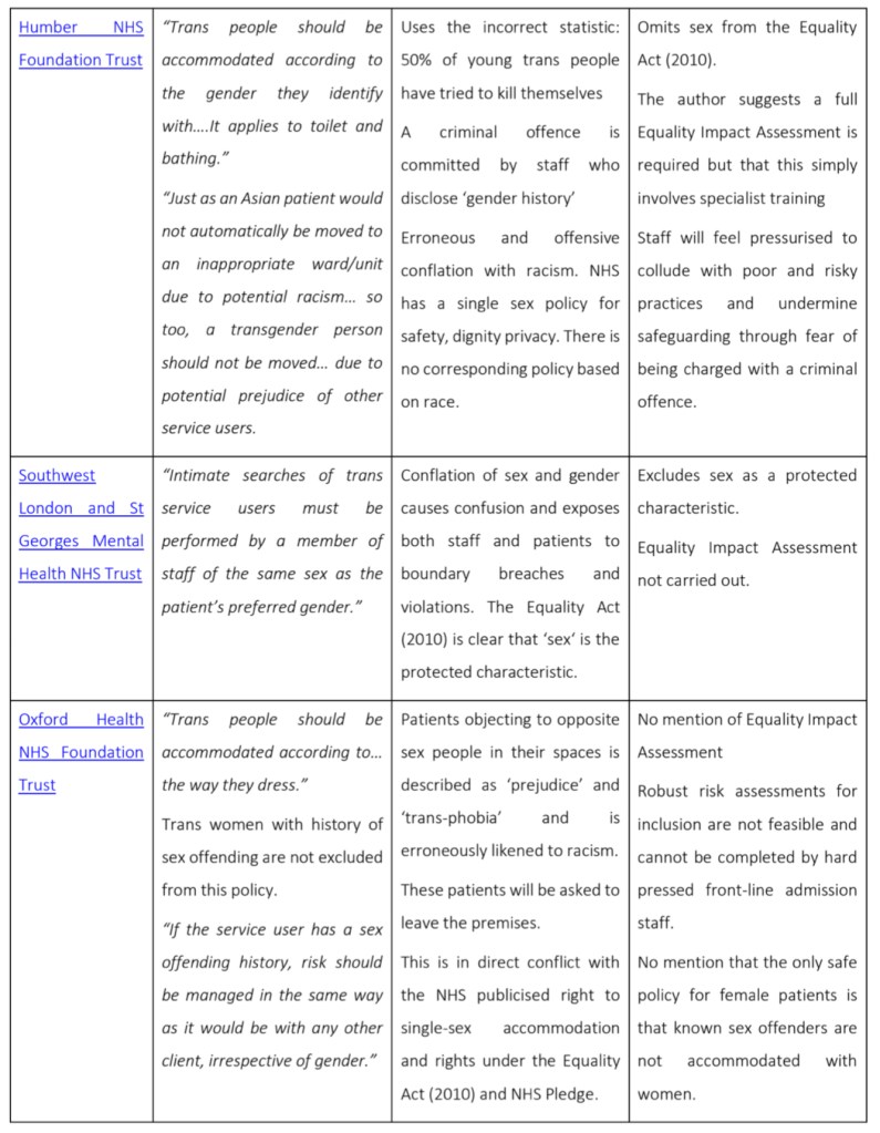 | Humber NHS Foundation Trust | “Trans people should be accommodated according to the gender they identify with….It applies to toilet and bathing.” “Just as an Asian patient would not automatically be moved to an inappropriate ward/unit due to potential racism… so too, a transgender person should not be moved… due to potential prejudice of other service users.” | Uses the incorrect statistic: 50% of young trans people have tried to kill themselves. A criminal offence is committed by staff who disclose ‘gender history’ Erroneous and offensive conflation with racism. NHS has a single sex policy for safety, dignity privacy. There is no corresponding policy based on race. | Omits sex from the Equality Act (2010). The author suggests a full Equality Impact Assessment is required but that this simply involves specialist training Staff will feel pressurised to collude with poor and risky practices and undermine safeguarding through fear of being charged with a criminal offence. |