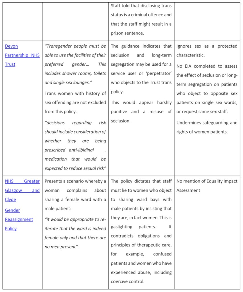 | Devon Partnership NHS Trust | “Transgender people must be able to use the facilities of their preferred gender… This includes shower rooms, toilets and single sex lounges.” Trans women with history of sex offending are not excluded from this policy.” “decisions regarding risk should include consideration of whether they are being prescribed anti-libidinal . medication that would be expected to reduce sexual risk” | The guidance indicates that seclusion and long-term segregation may be used for a service user or ‘perpetrator’ who objects to the Trust trans policy. This would appear harshly punitive and a misuse of seclusion. | Ignores sex as a protected characteristic. No EIA completed to assess the effect of seclusion or long- term segregation on patients who object to opposite sex patients on single sex wards, or request same sex staff. Undermines safeguarding and rights of women patients. |