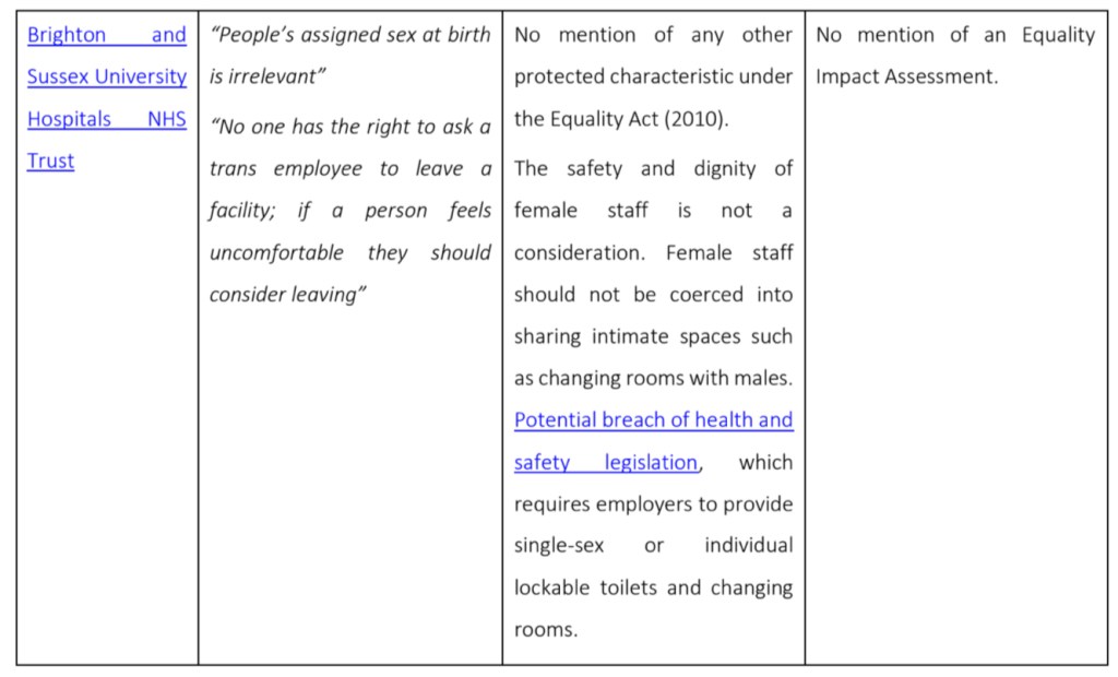 | Brighton and Sussex University Hospitals NHS Trust | “People’s assigned sex at birth is irrelevant” “No one has the right to ask a trans employee to leave a facility; if a person feels uncomfortable they should consider leaving” | No mention of any other protected characteristic under the Equality Act (2010). The safety and dignity of female staff is not a consideration. Female staff should not be coerced into sharing intimate spaces such as changing rooms with males. Potential breach of health and safety legislation, which requires employers to provide single-sex or individual lockable toilets and changing rooms. | No mention of an Equality Impact Assessment. |