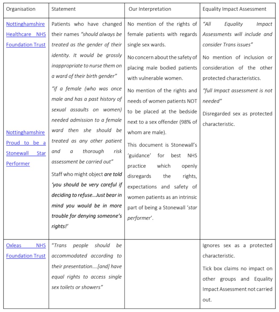 | Nottinghamshire Healthcare NHS Foundation Trust Nottinghamshire Proud to be a Stonewall Star Performer | “Patients who have changed their names “should always be treated as the gender of their identity. It would be grossly inappropriate to nurse them on a ward of their birth gender” “if a female (who was once male and has a past history of sexual assaults on women) needed admission to a female ward then she should be treated as any other patient and a thorough risk assessment be carried out” Staff who might object are told ‘you should be very careful if deciding to refuse…Just bear in mind you would be in more trouble for denying someone’s rights!’ | No mention of the rights of female patients with regards single sex wards. No concern about the safety of placing male bodied patients with vulnerable women. No mention of the rights and needs of women patients NOT to be placed at the bedside next to a sex offender (98% of whom are male). This document is Stonewall’s ‘guidance’ for best NHS practice which openly disregards the rights, expectations and safety of women patients as an intrinsic part of being a Stonewall ‘star performer’. | “All Equality Impact Assessments will include and consider Trans issues” No mention of inclusion or consideration of the other protected characteristics. “full Impact assessment is not needed” Disregarded sex as protected characteristic. |